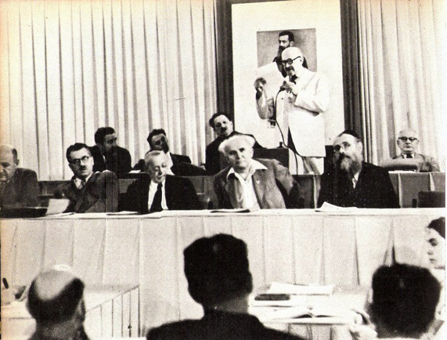 Фото: Выступление Хаима Вейцмана на заседании Временного государственного совета   Резолюция Генеральной ассамблеи ООН номер 181, принятая 29 ноября 1947 года, утвердила план раздела территории британского мандата в Палестине на два государства — еврейское и арабское. К этому времени руководство ишувом (собирательное название еврейского населения Эрец-Исраэль)  было сконцентрировано в руках Еврейского агентства во главе с Бен-Гурионом. Это был прообраз будущего правительства […]